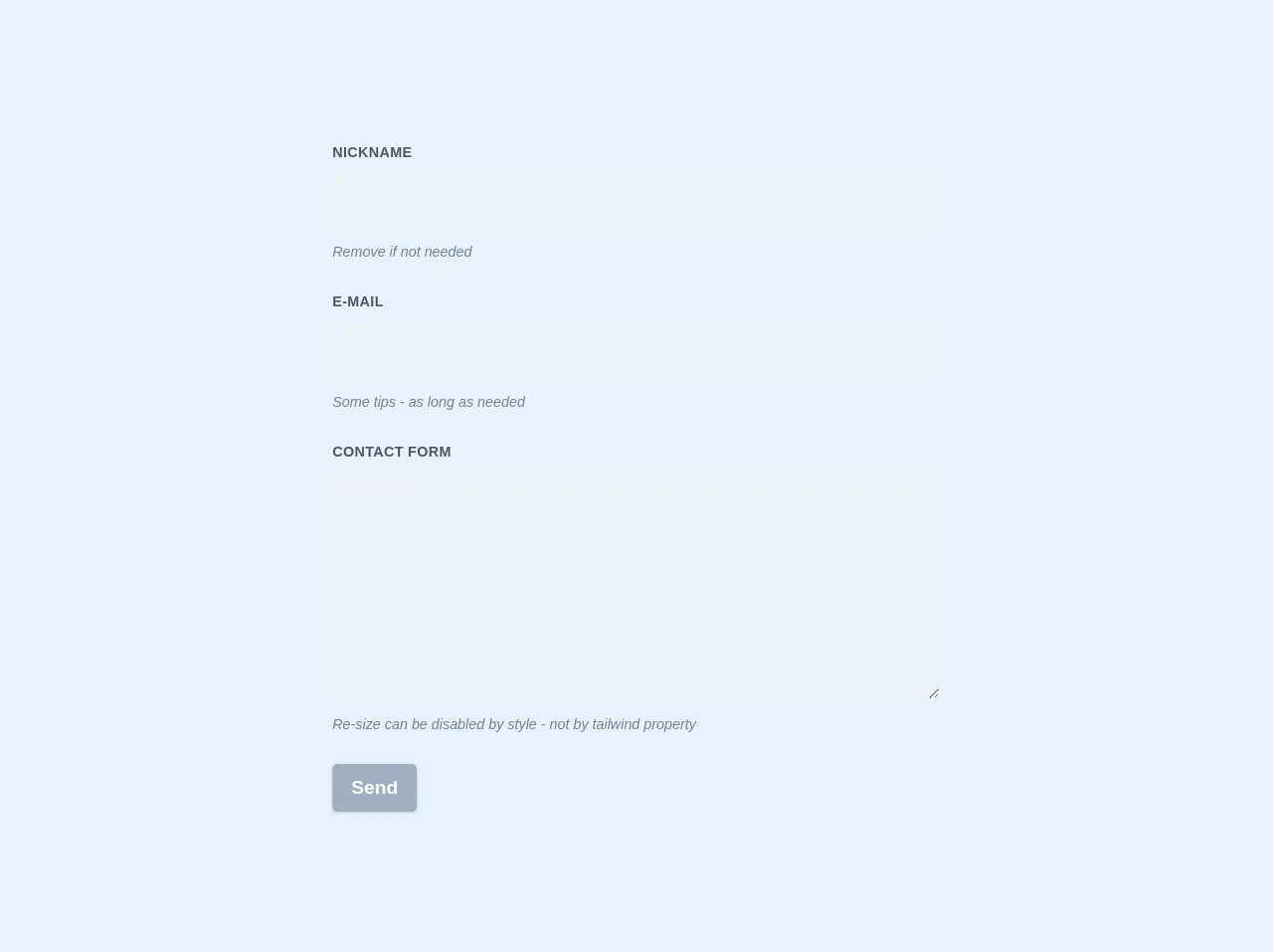 Published onJune 8, 20226 Easy Ways To Build A Basic Contact Form - Nickname With Tailwind CSS Without Even Thinking About ItFormsThis is a complete guide to how to use Tailwind CSS to make Basic Contact Form - Nickname component.