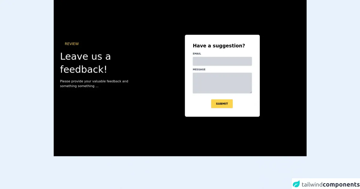 Published onJune 30, 2022Advanced Guide: Build A Feedback/Review Section With Tailwind CSSFormsPagesThis is a complete guide to how to use Tailwind CSS to make Feedback/Review Section component.