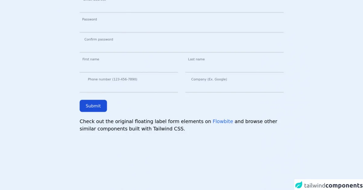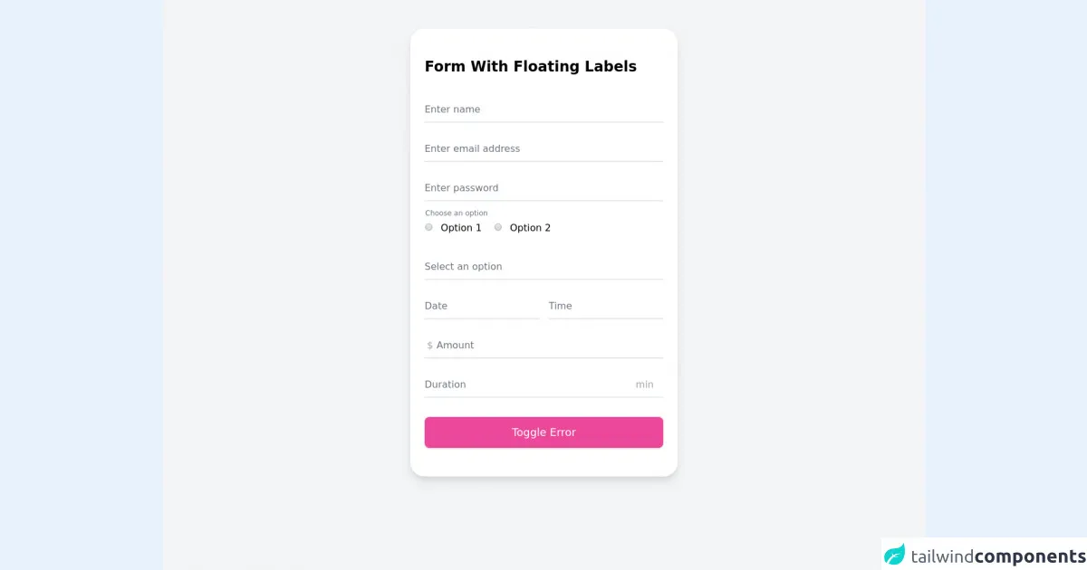 Published onJuly 1, 2022Here Are 6 Ways To Make A Floating Form Labels With Tailwind CSSFormsInputsThis is a complete guide to how to use Tailwind CSS to make Floating Form Labels component.