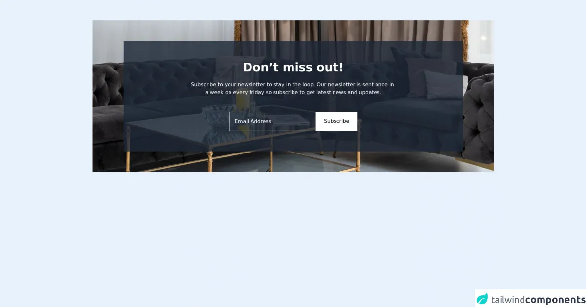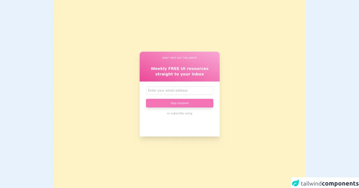 Published onSeptember 15, 20226 Easy Ways To Make A Subscribe Banner With Tailwind CSS Without Even Thinking About ItCardsFormsWidgetThis is a complete guide to how to use Tailwind CSS to make Subscribe Banner component.