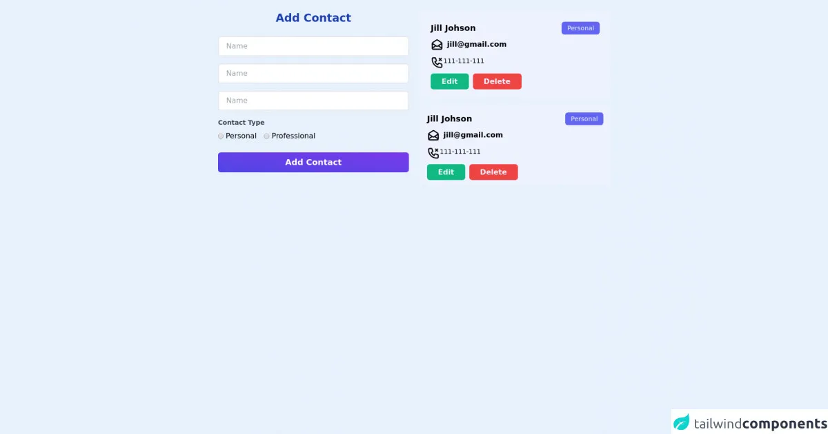 Published onJune 21, 20226 Easy Ways To Make A Contact List With Tailwind CSSFormsWidgetThis is a complete guide to how to use Tailwind CSS to make Contact List component.
