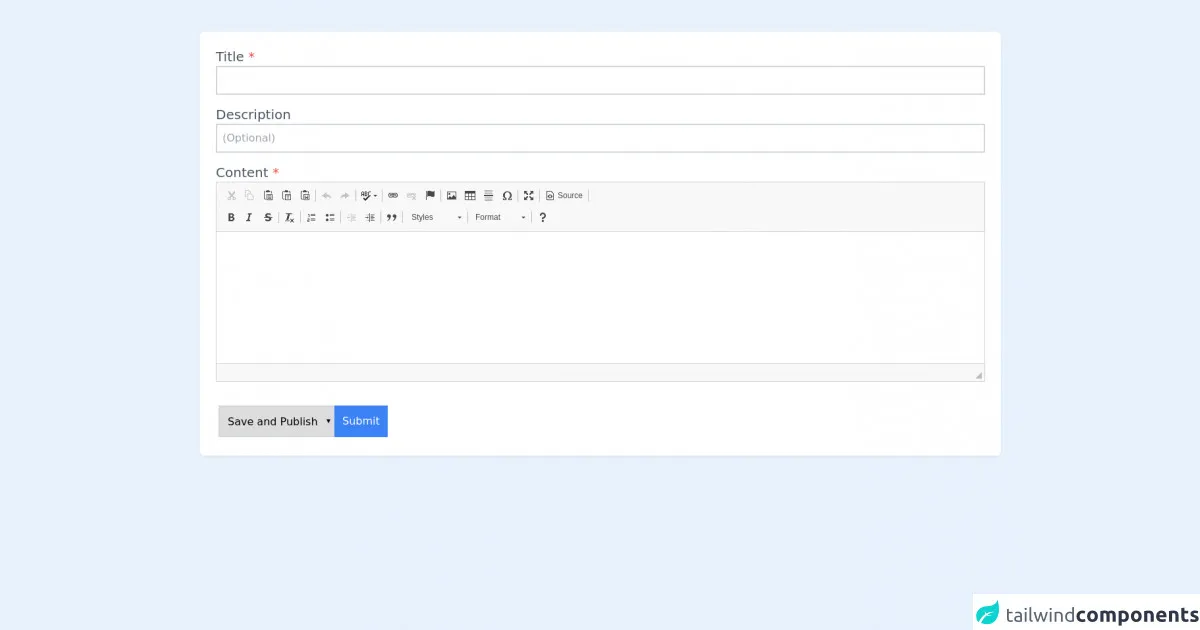 Published onSeptember 5, 20226 Steps To Make A Simple Blog/Post Form with CKEditor With Tailwind CSS Like A Pro In Under An HourFormsInputsThis is a complete guide to how to use Tailwind CSS to make Simple Blog/Post Form with CKEditor component.