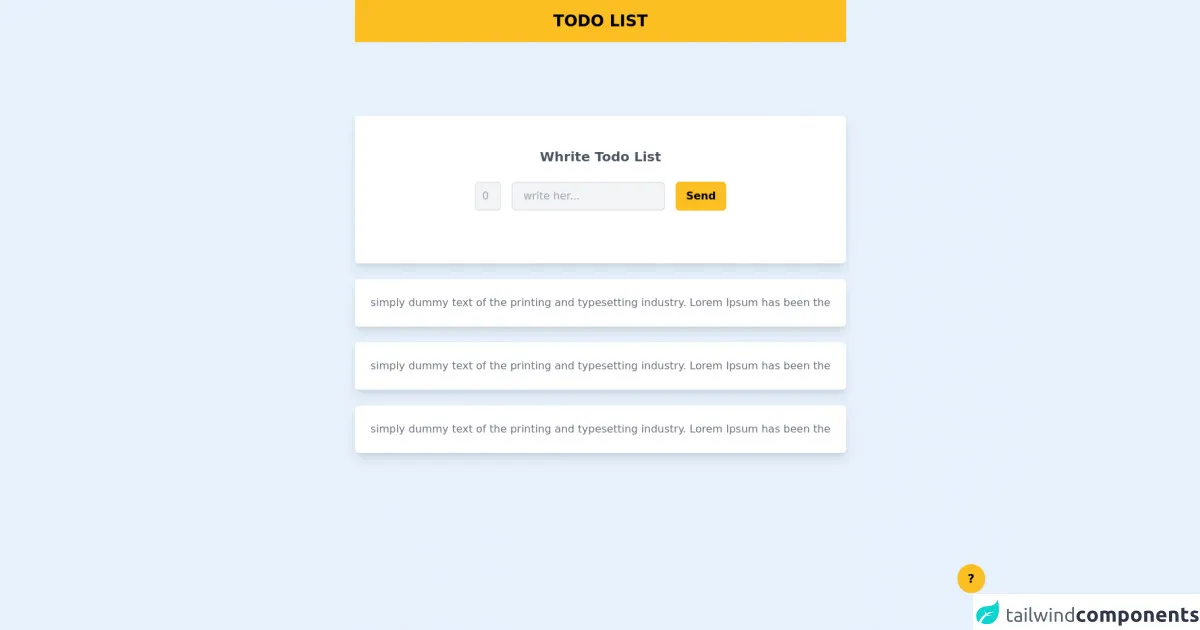 Published onOctober 19, 20226 Steps To Make A Todo List With Tailwind CSS Like A Pro In Under An HourFormsPagesWidgetThis is a complete guide to how to use Tailwind CSS to make Todo List component.