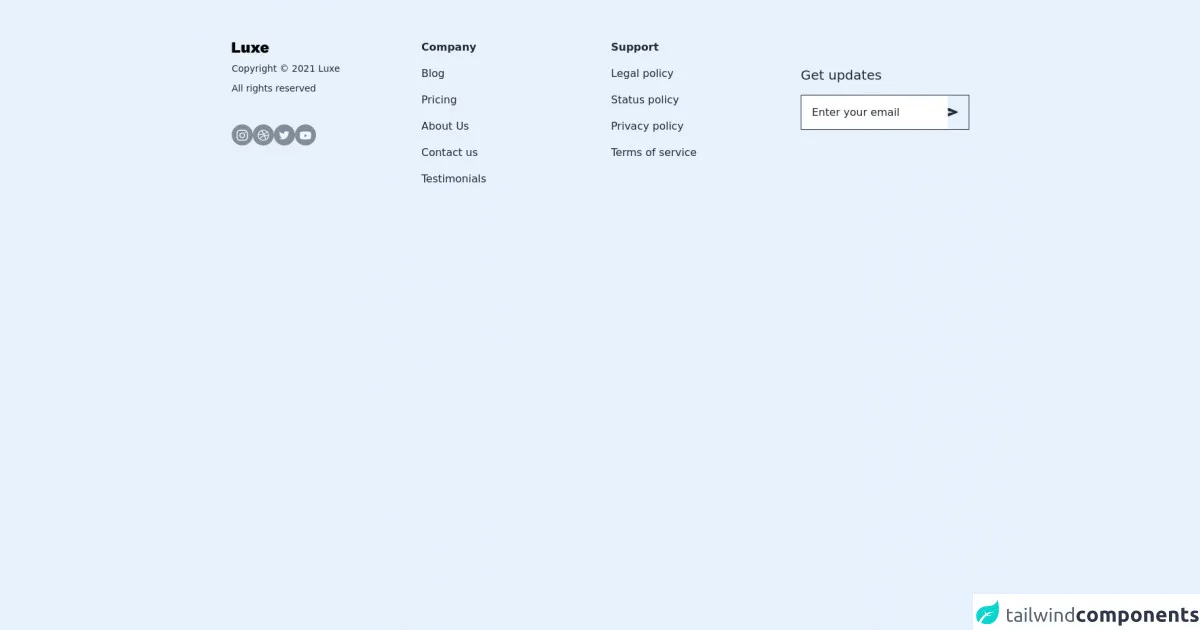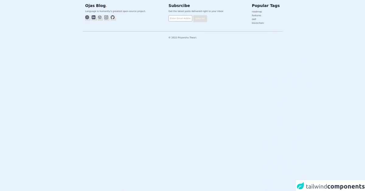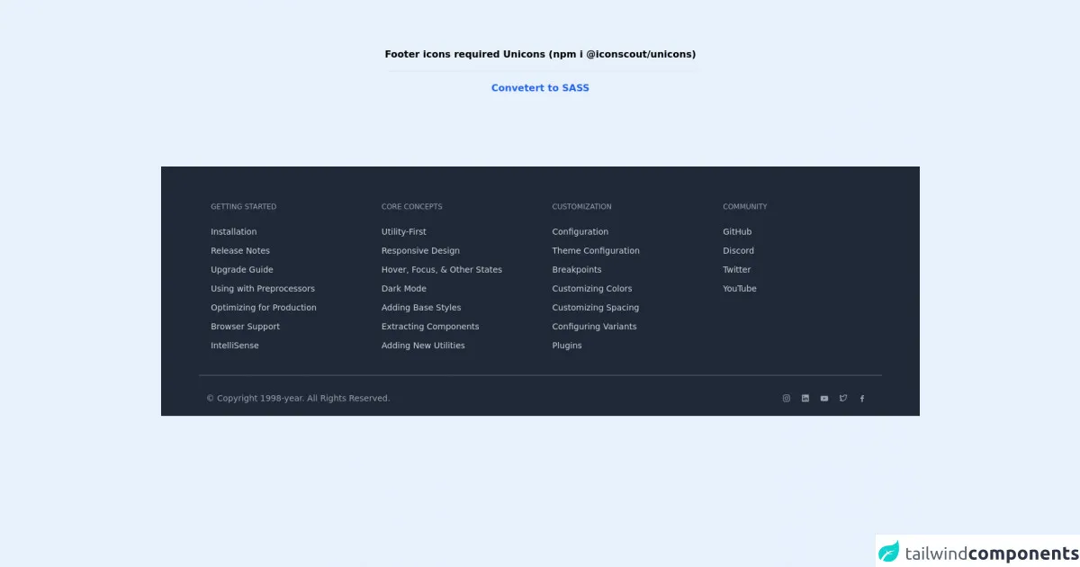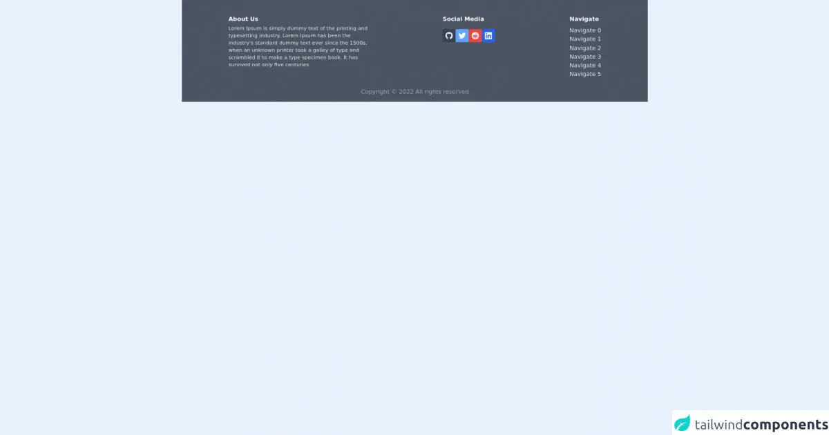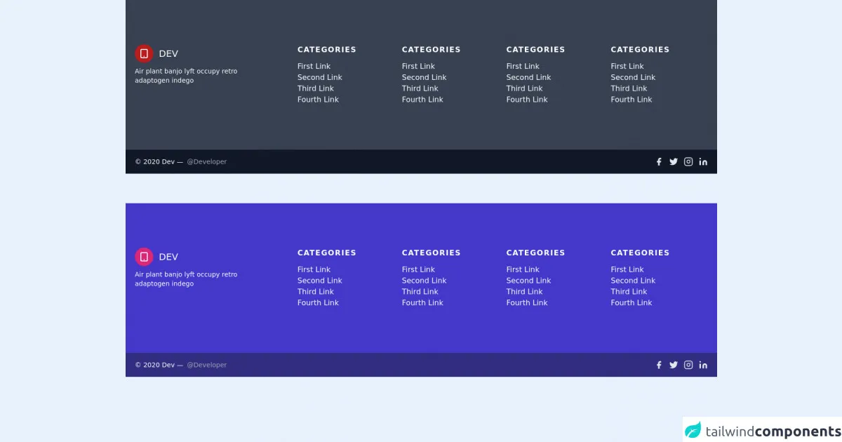Published onJuly 6, 2022Best Ways To Create A Free Tailwind CSS Footer Component With Tailwind CSSNavigationsThis is a complete guide to how to use Tailwind CSS to make Free Tailwind CSS Footer Component component.